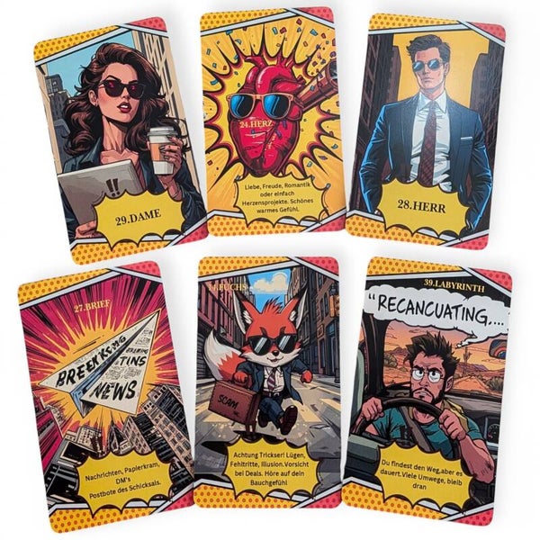 Das Comic Lenormand Edition bringt frischen Wind in deine Legungen.Humorvoll, ehrlich und mitten aus dem echtenLeben.Jede Karte hat ihren ganz eigenen Charakter , mal charmant, mal frech, immer klar in der Botschaft.Dieses Deck ist perfekt für alle, die Kartenlegen lieben, aber keine Lust auf steife Esoterik haben.